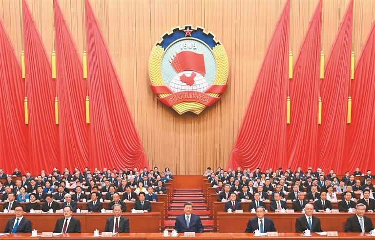 三月的北京,春启华章。人民大会堂大礼堂灯光璀璨,气氛隆重热烈。中国人民政治协商会议会徽悬挂在主席台正中,十面鲜艳的红旗分列两侧。