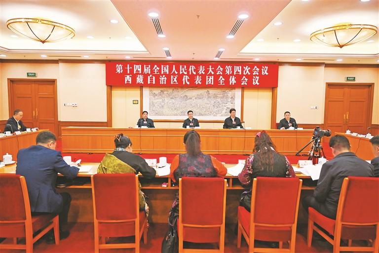 西藏代表团举行全体会议 审议全国人大常委会工作报告等 洛桑江村参加 王君正主持并讲话 严金海嘎玛泽登发言