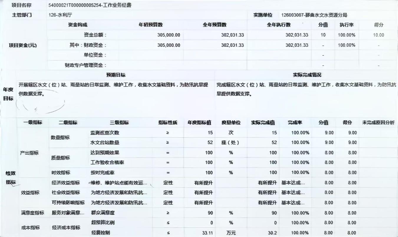 工作业务经费项目绩效自评报告:根据年初设定的绩效目标,项目绩效自评得分为99.5分。全年预算数为31.81万元,执行数为30.21万元,完成预算的94.97%。项目绩效目标完成情况:一是完成水文站、中小河流水文(位)点、雨量站共52处的水雨情监测任务及维护工作;二是设备正常运行率达到100%;收集资料合格率≥80%;三是项目按时完成率100%;四是成本控制在预算范围内。发现的主要问题及原因:无。