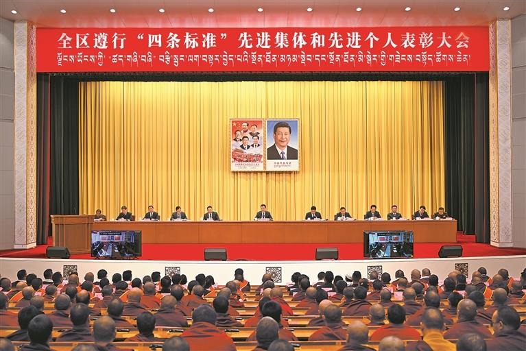 王君正在全区遵行“四条标准”先进集体和先进个人表彰大会上强调 突出分类指导 强化典型引领 积极推进藏传佛教中国化 努力为建设社会主义现代化新西藏凝聚力量 严金海主持 嘎玛泽登宣读表彰决定 刘江出席