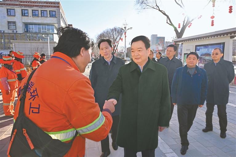 1月27日,自治区党委书记王君正在拉萨市检查春节、藏历新年节前市场供应保障等工作。这是王君正在拉萨市城关区金珠中路,看望慰问正在作业的环卫工人。本报记者 旦增西旦 摄